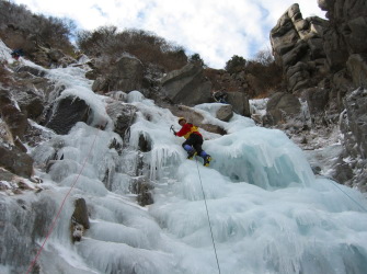| 雪は少ないながらも、天気も良いので楽しく登れる。 山上公園の手前に氷結した滝があるのでそこでアイスクライミングもどきをして遊ぶ。 そこからは急登を登り切ると山上公園に飛び出る。観光客だらけでちょっと違和感があるが小宴会をして楽しむ。 下りは中道をとることにしたが途中から雪もなくなりプラブーにはきつい下りだった。 |
