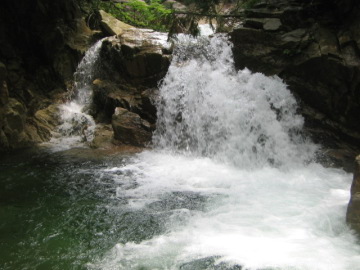 すぐ下流に渕もあるし・・ でもなんとなくしょぼい。。 渕をのぞくと爆流になってるのは増水のせい??
