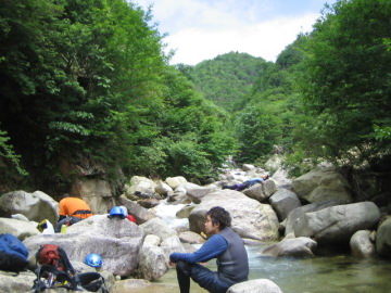 | やっとたどり着いたツメカリ谷出合 | 4m滝は右手から越えた |