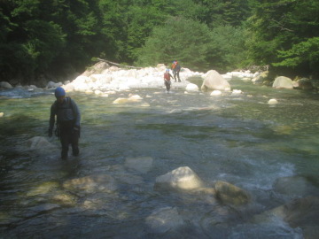 背中に刺さる仲間の視線が痛い・・ 早く何か言わないと!! 「とりあえず本流を上流に行けば何かあるやろ!」 根拠なき決断をして先ほどの登山道を上流に歩きはじめた。