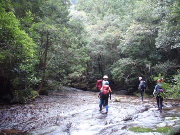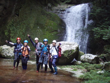 | 南紀の癒し渓に癒されに行こうっ!ってことで日帰りの沢を泊まりでのんびりしようと計画をたてたのだが・・・ 天気予報はどうやら2日目に雨模様。みなテンション激下がりですわ・・・(・◇・; ならば、日帰りに変えて、下山後山ろくで打ち上げ宴会しようってことで再びテンションを上げていく! 僕もその方が荷物が軽いし大賛成(^◇^)/〜☆ てなわけで、だらだらついでにクルマを一台下山予定地の口高田集落にデポすることにした。 今回は限りなくだらだらモードに徹するのだ。 出発地は内鹿野谷にかかる橋を渡った水車小屋のあるスペース。ここはトイレもあっていい場所だ。 さてさて準備をして出発。 しばらくは平凡そうなので谷沿いにつけられた内鹿野渓谷散策道を歩いていく。 南紀の谷は標高が低くても谷が深い。左手に流れを見ながら歩いていくと大きな一枚岩が見えてきた! 何やら標識が立っているのでみて見ると「一枚岩」とな ・・・・そのままや〜ん 散策道が木橋で右岸に渡るところから入渓する。すぐに「ズリ石」なる景勝地が! 岩がずれて中を通れるみたいだ。 こういうのは通らんと損損♪ よろこんでくぐりぬけた。 基本的に平凡なゴーロが続くのでだらだらと進んでいく。 いくつか淵が出てくるが10月の朝から泳ぐ気分にならず散策道に逃げること数度。 しかし、あまりに平凡なので俵淵ではどうちゃんと僕だけ泳いで越えようとバシャバシャと水に入った。 ・・・が、岩のトンネルを泳ぎ越えるとそこは通過不可能な岩間滝が・・・ はい、降参です(>◇<) すごすごと泳いで戻る。 さむいわ(;◇;) 俵淵を散策道から高巻いたら再びたいくつな河原が続く。しかし、前方は谷が狭まってきてそろそろ変化の兆しが♪ すると出ました2条スラブ滝8m! あれっ?2条ちゃうなあ〜 まあいいけど。 ここで滝を見ながら休憩タイム。 MATさんはツルでターザンごっこしようとするが釜にダイブをためらってやめちゃった。残念〜。 この滝で谷沿いに続いていた散策道は通行止めになってるが、かすかに残ってる道跡をたどって滝上へ。 沢床にもどるところがちょいとやらしい。トラロープが張ってあるがかなり微妙なトラバースだ。 MATさんはクライムダウンして、僕は垂れたトラロープでごぼう下り。あとのメンバーは安全策で懸垂下降で降りる。 降りたところがナメになっていてこれがまたやな感じ。滑らないように注意しながら安全地帯へ(^^; 左から水越谷が入るの見ながら進むと再び美しいナメ床になる。これぞ癒しの南紀だわ。 そうそう!今回はこれが目的なのです☆ 谷が左にカーブすると奥にナマズ口の滝13mが落ちている! 今回僕の一番の期待の滝!なぜなら名前が面白いから☆ でもどうしてナマズ口なのかわからん。 ここは左岸を木登りで滝上へ抜けた。 |