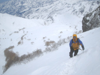 | 頚城山塊シリーズ2日目は焼山だ。 前日の三田原山から糸魚川経由で笹倉温泉に移動し車中泊する。 今日は行程が長いので4時半に起床するも、だらだら朝食と出発準備。5時40分にやっと歩き出す。 天気は下り坂の予報。晴れは午前中までらしいので急がなければ。。 除雪終了点でシール登行に切り替える。すぐに火打山川に架かる橋を渡り尾根に取付く。 林道をショートカットしながら登っていくとだんだん傾斜が急になり九十九折の登りに変わった。 一部雪壁状のトラバースもあるが無事通過。780m付近まであげると尾根の右手を回りこむみ緩やかになる。 ここで目指す焼山が姿を見せた。まだまだ先は長い。 複雑な地形が続く。ガスが出ればややこしそうなルートだ。 緩やかに登りながら進んでいくと前方にアマナ平が見えてきた。 アマナ平左奥の斜面を登りきると北面台地の末端に飛び出る。 これが噂の焼山北面台地!! すばらしいっ!! あたり一面無木立の真っ白な斜面。 しかし、まだまだ先は長いので感動に浸ってる時間はない。 歩く歩く歩く歩く・・・ しかし、いっこうに近づいてこない焼山。。 先を行くパーティが点にしか見えない。。 9時半頃あまりに腹が減ったのでランチタイム。 再び歩く歩く歩く歩く・・・ やっとのことで山すそまで近づく。このあたりから北西方面に回りこむように登る。 傾斜がきつくなりジグザグにきりながら高度をあげる。風も出てきてガリガリのクラスト状の斜面が増えてきた。 先の急斜面がガリガリやったら滑り降りる自信がないので標高2000mを越えたあたりでスキーをデポすること決定。 |