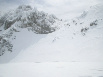 | アイゼンをつけてピッケルを取り出す。 さて、ここからさらに西に回りこむように高度を上げていく。 2250m付近から上の西斜面は完全にガリガリのウィンドクラスト。 ガリガリの斜面を登りきると火口に出た。さすがに火口湖は雪の下だ。 火口をぐるりと半周してひと登りで外輪にあがる。そこからすぐ左手に焼山山頂(2400.3m)があった。 山頂からは360度の大展望♪ 火打山、妙高山などの頚城山塊をはじめ海谷山塊、北アルプスなどが見渡せる。 しかし、あらかじめ引き返すリミットは12時と決めていたので残念ながらさっさと下山にかかる。 午後の気温の低下で最悪のモナカ雪に変わる前に滑り出さないといけない。 大急ぎでスキーデポ地まで戻る。 ではでは、さっそく滑降といきますか♪ ときどきクラストしてる程度で極上とまでもいかないながら気持ちの良い雪質がつづく。 しかし、北面台地はでかい。。 だんだん疲れてきた。 ターンするものめんどくさく最後はトレースに乗っかってちょっかりで台地末端まで滑る^-^; このあたりまで高度を下げるとザラメに変わっていた。 末端の急斜面をくだり、来たルートをときどき漕ぎながら戻っていく。 最後は太ももがだるくて何度かターンするたびに休憩をとりながら除雪終点まで戻った。 焼山北面台地。。 噂に違わず素晴らしいところでした!! 来シーズンもぜひ再訪したい場所です。 |