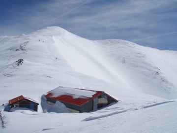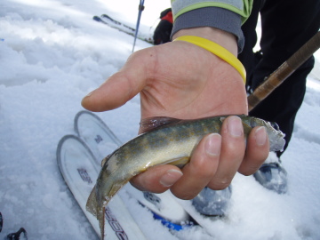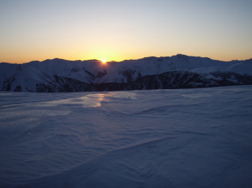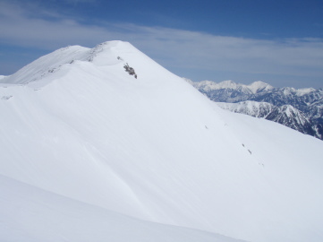 | 中央カールも気持ちよさそうだが目的は金作谷カールなので先を急ぐことに。 薬師岳のてっぺんにはこれまたカリカリの尾根を進む。雪庇のない西側斜面をアイゼンを効かせ強風に耐えながら進んでいく。 薬師岳の西側は適度な傾斜で広大な斜面になっている。こちらを滑るのも楽しそうだ。 えびの尻尾がびっしり張り付いた祠がある薬師岳(2926m)のてっぺんに到着。 さていよいよ金作谷カールとご対面。頂上のすぐ脇がドロップポイントとのこと。覗き込むとなるほど楽しそうなところだ☆ まずはフォールラインに沿って2箇所弱層テストをしてみる。前日の降雪があったが想像以上に安定しているじゃん。 じん帯を痛めてるmoto.pを残してさっそく飛び込んでみる。 気持ちいい〜〜☆ 登り返しがしんどいのでカールの底まで滑らず途中から右手の中央カールとの間の尾根にトラバースする。 一瞬だったがとても楽しめた♪ 薬師岳のてっぺんまでひーひー言いながら登り返す。moto.pは中央カール側に滑り込んで登り返してるところ。 あらためて薬師岳のてっぺんからの展望を楽しむ。まだ冬の衣装を着た雷鳥がうろうろしている。眼下には上の廊下を見下ろせる。 素敵なところだ。 次の目的は薬師沢右俣なので東南稜分岐まで戻ることにする。 moto.pがトラバースでいけるんちゃうかと言うので中央カールの上部を滑っていくがとてもじゃないが無理。 途中からつぼ足で稜線まで登る羽目になった。 東南稜分岐で薬師沢を見下ろしながらランチタイム。そろそろ睡眠不足がたたってきた。眠い。 薬師沢右俣のドロップ地点は東南稜分岐直下。さっそく滑り出す。こちらも快適快適♪ どんどん滑り降りる。 僕は谷が左に曲がるあたりで薬師平に登り返そうと主張するが、 かっきーが「岩魚釣りたい釣りたい」と言うのでそのまま谷沿いを下ることにする。 広々とした谷幅がどんどん狭まってくる。ところどころで谷が割れだすとかっきーの目が輝きだした。 適当なところで竿を出すとさっそく岩魚をゲット。やや小ぶりだが刺身になっていただいた。 ここからは同じく右俣を滑り降りてきた群馬のkaiさんと小屋まで同行になる。 その後も谷の割れ目を避けながら下っていくと中俣との出合に到着。出合からは中俣を登り返し太郎平を目指す。 この頃になると疲労もピーク。 体力ありあまってる二人にはかないません。 最後の急登ではバテバテになる。 それでも16時半ころには小屋に到着。 久しぶりの営業小屋でのんびりくつろぐことが出来た。 さすがにGW。案内された部屋はすでにいっぱい。僕の寝床はどうやら押入れのようだ。 これが幸いふすまを締め切ると真っ暗になり夕食を終えるとそのまま朝まで爆睡できた。 |