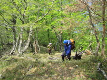 当初の予定では馬の鞍峰から杉沢を下降の予定だったが初日の出遅れの影響で尾根ずたいに戻ることに。。 台高山脈主稜線を池木屋山目指して歩いていく。 青空の下、稜線を抜ける涼しい風、シャクナゲや山つつじの花々を愛でながらも、アップダウンを繰り返す稜線にヘトヘト。 ホウキガ峰を越えて最後の急登りを登りきると池木屋山(1395.9m)に到着。 いつも賑わっている台高山脈の交差点のこの山も今日は僕たちだけだ。ここで主稜線を離れ東尾根に入る。 道が不明瞭な焼山の尾に入らず焼山源頭の崩壊地を通過した1332mピークから南に伸びる尾根に入った。 途中、薄くなったり濃くなったりする踏み後を辿りながら1243mピークを越えてどんどん下る。 日差しが強くなり、みなダレダレ状態(>◇<) そのうちモノレール跡が出てくるのでそれに沿って進んでいく。 廃小屋の前で小休止し、そこから落ち葉のすべり台のような急斜面の道をギャーギャー言いながら下りきると六丁峠に出た。 峠からも急斜面が続くがまだ階段とかあって若干マシな感じ。 でもこのあたりから再びヒルヒル地帯なのでコケたくはないなあ。。 斜面を下りきると大和谷本谷だ!! 干上がった僕達はすぐに水に飛び込む♪ サイコー♪♪ 駐車地まではもうヘトヘトなので歩道を使うことにする。 途中崩れてる場所があるが階段などで補修しているので問題なく駐車スペースまで戻ってこれた。 最後に靴の中などをチェックをすると出るは出るはヒルヒルだらけ。。 しかし今回は全員実害なしでした。 やっぱりこの周辺は多いなあ。。 てな感じで今年最初の沢登りは雨には降られましたがとても楽しい2日間でした♪ |