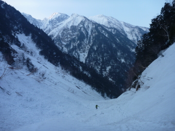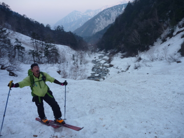 | 飛騨沢に滑り込む かっきー | クラストは緩んで快適 |
