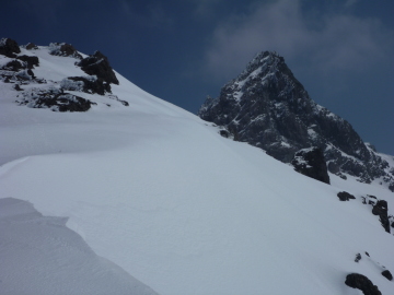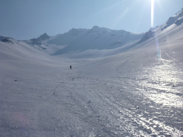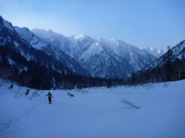| 久しぶりに飛騨沢を滑りたいと思い、かっきーと向かいます。 埼玉を21時半に出発し、新穂高の駐車場には2時過ぎに到着。 3時には歩き出したいので、30分だけ仮眠することに。 結局ほとんど寝れないまま、準備して3時10分ころに歩き出しました。 足の爪を痛めているので、蒲田川右俣林道は行けるとこまでアプローチシューズで歩きます。 兼用靴とスキーをザックに取り付けるとさすがに重いです。 かっきーは相変わらず朝一は弱いので、ひーひー言いながら歩いてはります。 穂高平あたりから雪が続くようになってきたので、アプローチシューズから兼用靴に履きかえました。 シール歩行で林道を進むと白出沢に到着。薄明るくなってきて穂高の山並みが見えてます。 しばらく登山道を進みますが、河原が見えてきたあたりで沢沿いに降ります。 ブドウ谷やチビ谷からのデブリの押し出しを乗り越えながら進みます。 今日は気温が高い為か、デブリがガチガチに凍ってないのでスキー履いたまま乗り越えれました。 河原の雪割れが進んでいるので、帰りは滑るのに苦労しそうです。 滝谷からもデブリが出てますが、このあたりはあらゆる斜面からデブリが出てデブリランド状態。 その代わり、ようやく谷が埋まったのでルートは好き放題にとれます。 傾斜が強くなり高度を上げていくと、背後に穂高の山並みが見渡せるようになります。 稜線付近に朝日があたり美しい景色です。 坂を上りきると一転広々とした台地に出ます。森の中には、槍平小屋が建っています。 小屋の脇にはテントが一張はってありました。 槍平の広々とした雪原で小休止。ここまでで3時間強。体力が落ちている割には想定内です。 槍平を抜けると、いよいよ飛騨沢の登りになります。 ここからはひたすら登りだけ。斜度が上がった雪面をシールで登っていきます。 沢が右へカーブすると、前方はるか先に槍ヶ岳の稜線が見えてきました。 しかし残念ながら飛騨沢からは、槍の穂先は見えません。 雪面はクラストしているので、傾斜が強くなる前に、アイゼンに切り替えました。 かっきーはしばらくクトーでねばるようです。 このあたりから、かっきーのエンジンがかかってきてどんどん先行していきます。 振り返れば、笠ヶ岳が綺麗に見えています。 斜度が強まる中を、ひたすら直線的に登っていきます。かっきーもアイゼンに切り替えたようです。 久しぶりに3,000mを超えるので、酸素の薄さで息があがりまくり。少し歩いては、息を整えないと進めません。 最後は傾斜が緩まり、ようやく飛騨乗越に到着。かっきーを10分くらい待たせてしまいました。 ここで、大槍とご対面。相変わらず美しい姿をしてます。 テント場の斜面を登りきって、槍ヶ岳山荘に到着。ここで標高3,080mです。 |