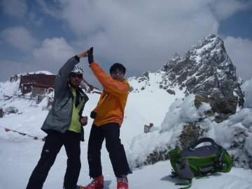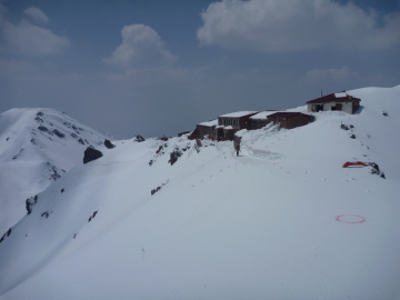 | 大槍の往復は、岩と雪のミックス状態。途中まで登ったところでアイゼンの不調が発生。 今回はてっぺんに立つのは断念しました。 お天気良いので残念ですが、今まで10回は登ってるので、まあいいか。 かっきーが戻ってくるのを待って、ランチタイム。 3,000m越えなのにじっとしていても暑いくらいの陽気です。 槍ヶ岳山荘は明日から営業開始のようで、荷揚げのヘリが往復しています。 それでは、帰りましょう。時間はお昼過ぎです。飛騨沢のクラストは緩んでるでしょうか? テン場の入り口で滑降の準備をします。飛騨乗越までは、結構雪が飛ばされていて岩が出ています。 快適とは言い難い滑りで乗越へ下りました。 ここからいよいよ飛騨沢に入ります。 雪質がわからないので、最初の急斜面は慎重に滑り込みます。 雪質は堅いですが、クラストは緩んでいて問題なくターンできます。 しかし、こけるとなかなか止まれません。 広い沢なので思い思いにターンをしながら一気に高度を下げていきます。 登りはつらいのに、下るのは一瞬です。 沢が左にカーブするあたりは良く滑るザラメで快適なはずですが、足が疲れてターンするのもしんどい状態。 気温も上がり、暑い暑い。槍平小屋の前で、小休止。楽しいのはここまでです。 あとはデブリと藪スキーの苦行のはじまり。 槍平から高度を下げていくとデブリランドに突入。雪が緩んでいるのでなんとか滑ることはできます。 慎重にルートを選んで進みます。スキーを履いたまま、デブリの山を乗り越したり藪の中をくぐりぬけたり。 またまた、足の爪が靴にあたって痛くなってきました。 デブリに突っ込んで急停止した時などはあまりの痛さに半泣き状態です。 この区間はほんと苦行でした。 ブドウ谷過ぎたあたりで、シールを貼り付けて登山道まで登り返します。 そのまま白出沢まで歩いていきました。 右俣林道に入ると、シールを剥がし再び滑り出します。 雪がとぎれるところで、アプローチシューズに履き替えました。 あとは新穂高温泉まで、のんびり林道歩きです。 槍平から上は快適でしたが、そこまでのアプローチで疲れ倍増です。 しかし、苦行の先の飛騨沢は滑るには楽しいところです。 |