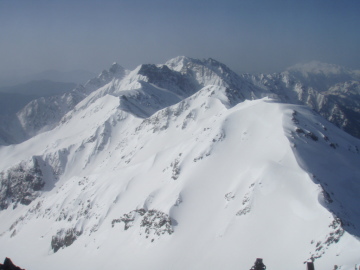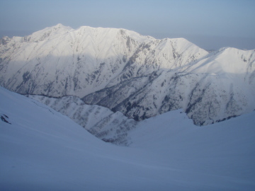 | 思い起こせば2006年5月、深夜の白出沢出合で槍穂周回にチャレンジしてる操さんに出会ったのが始まり。 ワンデイで槍と穂高を一周・・・ 「そんなことが出来るんや」と驚き来年はチャレンジしたいと思いたって3年。 毎年計画するも天気に恵まれずやらなんやらでやっと今年念願が叶いました。 今年は天気も日程もバッチリだ、計画通りいってないのは体力作りくらいなもの。 山小屋も上高地もまだOPEN前で安易に逃げられないように背水の陣を張っていざチャレンジ。 前日の夕方に新穂高無料駐車場に到着。少し仮眠しようと思ったが眠れない。 夜の11時半にごそごそ準備をして新穂高バスターミナルに移動。 登山計画書を提出し0時ぴったりに歩き出した。空は満天の星。今日は1日晴れの予報だ。 昨年はこの林道歩きで足の爪を傷めたので今回はアプローチシューズで出発。 しかしものの30分も歩かないうちにミッドソールが崩壊。靴底が真っ二つに割れる。 以前の教訓がまったく生かされてない。みなさん靴の経年劣化にはくれぐれも注意しましょう。 靴底に負担がないようにだましだまし歩いて行く。 穂高平小屋の少し先から雪が続くようになった。兼用靴に履き替えてアプローチシューズはデポ。 しばらくはつぼ足で歩いていく。今日は月の出が遅く真っ暗。ヘッデンの明かりが頼りだ。 出発して1時間半で白出小屋に到着。ここからシール歩行とする。 白出沢は流れが出てるがなんとか雪が繋がってるようで帰りはここまで滑って降りれそうだ。 対岸の登山道は雪がとぎれとぎれになっていた。しばらくスキー板の着脱を繰り返し進む。 ブドウ谷付近で右俣谷に降りて河原沿いを進む。チビ谷のデブリを乗り越える時にシールが滑って転倒。あたたた 凍ったザラメ雪で腕がすり傷だらけになる。前回の槍ヶ岳往復の時もここでコケたのに以前の教訓が・・ 滝谷はところどころ水流が出ていた。右俣谷が完全に雪に埋まりだすとまもなく槍平に到着。 あたりは真っ暗なのでテントが張ってあるかはわからなかった。 徐々に傾斜が強くなるがシールで進んでいく。谷が大きく右に曲がるあたりで薄明るくなってきた。 前方に飛騨沢の全貌が見えてくる。振り返ると笠ヶ岳の稜線が見えている。 5時半くらいに笠ヶ岳に朝日があたる。絵にかいたような晴天だ。 一段と傾斜が強くなるころスキーを担ぎにしてアイゼン歩行に変えた。 今日は長い1日だ。あまり飛ばしすぎないようにセーブモードで登って行く。 それでもヒーヒー言いながらやっとのことで飛騨乗越に到着。 そのまま槍の肩まであがると大槍のお出迎え。ここまで6時間50分。まあ想定内か。 槍岳山荘はまだ除雪前のようで、冬期小屋の前で荷物を下ろし大槍のピストン。 槍ヶ岳(3180m)のてっぺんは相変わらずの絶景だ。360度の展望を楽しむ。 大槍の往復で1時間10分費やしてしまった。ちょっとモタモタし過ぎか?? ではでは今回一本目の滑降。これを滑るともう後戻りは難しい。とにかく進むのみ! 雪面はおとついの雪の影響か真っ白のすべすべ斜面。コントロールの効く気持ちの良い状態だ。 あっという間に殺生ヒュッテ付近まで滑り降りた。そこからは天狗原目指してトラバース気味に滑って行く。 岩壁の下を横切る時は上部からの一発を警戒しながら通過。 疎林のあたりでスキーからアイゼンにチェンジ。急斜面の作業なので荷物を流さないように慎重に。 振り返ると槍ヶ岳がすでに遠くに見える。スキーの機動力は素晴らしい。 つぼ足で急斜面をこなして天狗原にあがる。あたり一面真っ白な世界。もちろん天狗池も雪の下だ。 まさにこの景色を独り占め状態。しかし横尾尾根までの登り返しは気分的に疲れる。 標高差200mちょいの登りだが雪の白さが距離感をなくしてしまって広大な景色にのまれてしまう。 やっとのことで横尾尾根の乗越地点に到着。ここで9時40分。まだ許容範囲か。 尾根にあがると横尾本谷が眼下に見渡せる。さらに下方奥に登り返す涸沢が見えている。 |