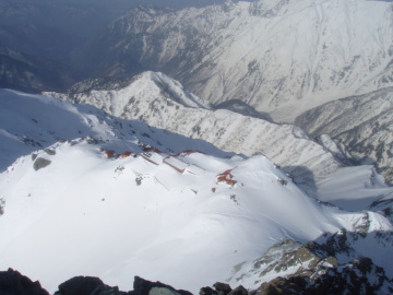 | 大槍 | 槍のてっぺんから槍岳山荘を見る |