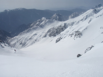 | これから滑る横尾本谷右俣と奥に見える涸沢 | 横尾本谷右俣に滑り込んで振り返る |