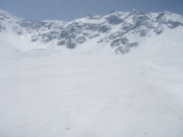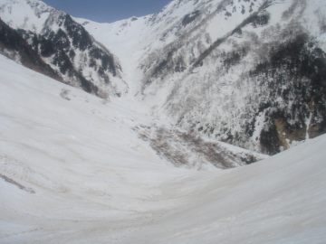 | いよいよ横尾本谷右俣の滑降。涸沢出合まで標高差800mだ。 今回の計画を操さんとは逆の時計回りにしたのはこの横尾本谷を滑りたかったからだ。 足まわりを滑降モードに変えて滑降準備オッケー。すべすべの斜面に飛び込む。サイコー♪ どんなに辛い登りでもこの瞬間が帳消しにしてくれる。 しかしおとといの雪と雨の境界線を過ぎると薄汚れたグサグサの雪に変わった。 こうなるともう我慢の滑り。二股で横尾本谷左俣と合流するとデブリランドと化す。 グサグサのデブリを乗り越えながら涸沢出合に到着。実質20分弱で滑り下りた。 さあここから登りのメインイベント。穂高岳山荘のある白出乗越まで標高差1100mの登り返しだ。 時間は10時半。まあギリギリな感じ。板にシールを貼り付けて歩き出す。すでに気温はマックス状態。 グサグサ雪が重い。振り返るといま滑り降りてきた横尾本谷が見えている。 山小屋のある涸沢カールの底まではだらだらした登りが続く。このあたりで暑さと疲労でヘロヘロ状態になってきた。 涸沢がやや右に方角を変えると雪に埋もれた涸沢ヒュッテらしきものが見えてきた。 ちょうど作業中なのか除雪機で舞い上がる雪と何人かの人影が見えている。 その奥には穂高連峰が壁のように連なっている。今からあの稜線の高さまで上がらなければならない。 涸沢カールに入り込むと右手にこれも除雪作業中の涸沢小屋が見えた。 その横には昨年滑った北穂沢がなつかしい。正面にはこれから向かう白出乗越が見えている。 ここからやや傾斜が出るのでつぼ足に変えてみる。予想通りグサグサ雪に足がとられる。 しばらく頑張るがあきらめてシール歩行に戻す。この登りで予想以上に時間を食ってしまう。 10歩あるくごとに呼吸が乱れる。心配機能がもう限界。刻々と時間は過ぎていくがなかなか足が進まない。 この時点で残念ながら奥穂高岳ピストンはあきらめた。左手にこれまた昨年滑った奥穂の直登ルンゼがなつかしい。 なんと、この時期に涸沢の上部斜面で遊んでるボーダーとスキーヤーがいてはる。 上部はこの人たちのつぼ足トレースをありがたく使わせていただいた。ありがとうございます。 ほんとにやっとのことで白出乗越にたどり着いた。涸沢出合から5時間半かかったことになる。まさに体力不足を痛感。 こちらも山小屋の除雪作業まっさかりだ。作業してる横をすり抜けさせていただいて白出沢に入る。 最上部はガレが顔を見せいているので10mほど下ったところで滑降準備をする。 時間は16時。涸沢側は少し日が陰ってきたが白出沢はまだまだ太陽が元気だ。 除雪作業中の穂高岳山荘のスタッフさんに見送られて滑りだす。白出沢も気持ちいい斜面。 しかし足が疲れてるので休み休みの滑降になる。ここには昨日か今日かのシュプールがあった。 どんどん滑り下りて行くとこちらもデブリランドになる。荷継沢が右から入ると白出大滝の高巻道に入る。 登山道は雪に埋まってるので迷うが強引に下りて行く。 白出沢に戻ると先ほどのシュプールが白出大滝方面から続いている。まだ滝は雪が繋がっていたのかな。 そこから下はさらにデブリランドが続くが、この気温で雪が緩んでいるのでなんとかこなしていくことができる。 登山道が沢から離れるあたりでようやくデブリも落ち着き、あとは河原に残った雪をつたって滑り降りていく。 あっという間に白出小屋に到着。標高差1400mを1時間半で降りて来れた。 あとは林道を滑っていき雪の途切れる地点で往きにデポしておいた崩壊靴を回収する。靴というか単なる重石になったが・・・ 新穂高バスターミナルに着くころには薄暗くなってしまった。 下山届を提出し無料駐車場に戻ると僕の車しか残ってなかった。 すでにあたりは真っ暗。温泉に間に合うようにさっさと新穂高をあとにした。 結局行動時間は18時間50分に及んでしまった。楽しかったけど疲れました。課題は体力です。 しかしスキーの機動力は素晴らしいです。累積標高差約3370m。たまにはこういうのもありです。 個人的には3年間の思いをやっと叶えることができました。思い入れが強い分満足感も大きいです。 |