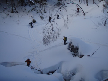 | 昨年に続き再び四ツ岳に行くことになった。いい山は何度登ってもいいのだ。 平湯バスターミナルで関東チームと合流し平湯キャンプ場に移動。さっそく歩き出す。 ここは標高差1400m。さあ頑張ろう〜 ラッキーなことに駐車場から先行トレースがあったのでありがたく利用させていただく。 キャンプ場を通り抜けて少し進んだところから急斜面を尾根に乗りあがる。 尾根上は緩やかだがすぐに傾斜がきつくなる。急斜面を登りきると尾根の反対側に大滝川が見えてくる。 大滝川には何箇所かブリッジが架かっているがどれも不安定そうだ。 とりあえずマシなやつを選んでけも氏が渡る。ケモ氏はややこしいところは好んで先頭に行きたがるので助かるのだ。 大滝川を渡渉すると今度は四ツ岳北面に続く尾根に乗りあがるのだがここは雪壁になっている。 木の枝を掴みながらモンキークライムで乗りあがった。さて尾根に乗ってしまえばあとは延々と続く樹林帯の登り。 どんどん登っていくとラッセルしていただいていた2人組みに追いついた。 お礼を言って先に進む。けも氏がどんどんラッセルしていく。 ケモ氏はこう言うところも好んで先頭に行きたがるので助かるのだ。 続いて私もラッセルするがすぐに息があがりダウン(;◇;) あとは一番元気な大ソロさんにおまかせ♪ 後ろを振り返ると槍穂高連峰がくっきりと見えている。前方に岩峰が見えてくるとそろそろ森林限界。 右にトラバースしていくと気持ちよさそうなオープンバーンが出てくる。右手には猫岳から大崩山への稜線が美しい。 しかしすぐにガスがかかりだした。前回に続き今回も頂上からの展望はお預けになりそうだ。 クラストした斜面を登りきるとそこはもうてっぺんの領域だ。本峰を左からぐるっと回りこんで四ツ岳山頂(2744m)に到着。 予想通りガスで展望はまったくなし。シールを剥がして滑る出す。クラスト斜面をガリガリと滑り降りる。 高度を下げると気持ちいい斜面に変わり楽しめた。樹林帯は適度にパウダー。 どんどん滑り降りて大滝川の渡渉点でシールをつけて対岸の尾根に登り返す。 尾根からは最後の滑りを楽しんでキャンプ場に滑り込んだ。 前回に続き頂上はガスで残念。また次回の楽しみとしておこう〜 同行の皆様ありがとうございました。 |