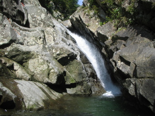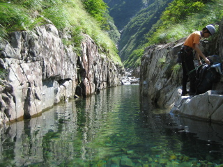 | しばらく美しいナメと釜が続いていく。お天気もよくてとても気分がいい♪ その先、右に90度折れ曲がったところがウナギ淵(赤淵)と呼ばれているところ。 ここで先行していた2人組パーティに追いついた。 その時の水量によって淵の長さが変わるという事だが、今回は水量が少なく50mくらいの泳ぎで通過できた。 泳がずに左岸を進むこともできるらしいが水温も丁度いいので出来るだけ泳ぐ泳ぐ^-^ その先の淵の出口は左からの4m滝となって落ちている。左壁から滝上に上がると美しい3段30mナメ滝が続く。 正面に抱返り沢が見えてとても素晴らしい景観。 左岸のスラブを慎重にへつりながら進んでいくと十字峡にたどりついた。 右手から大倉沢。正面に抱返り沢。本谷は左に折れている。本谷はゴルジュとなっており右岸を進む。 ゴルジュ出口は抱返り滝2段20mとなっている。 ここは左から直登した。下段はラクラク、上段は滑りやすく慎重に登り滝上へ。 滝上からはまたまた美しい釜とナメが続いていく。 この沢は全般にとても明るい雰囲気で開放感にあふれている^−^ たとえゴルジュの中にいても陰惨な感じがまったくしない。 てなことを考えながら歩いていると今度は3条10m滝があらわれた。 |