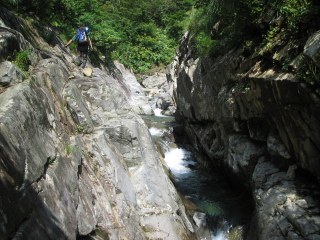 | 魚止ノ滝上に続くゴルジュは右岸バンドを行く | ナメ3mは泳いで取り付いた^-^ |