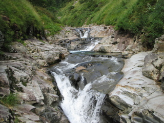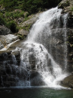 | 3条10m滝は左のチムニーから滝上にあがった。 なおもナメ床を進んでいくと正面から七ツ小屋沢が入り本谷は右から4mの滝となって落ちている。 油断してると直進してしまいそうな場所だ。右の本谷をとって進んでいく。 しばらく単調な渓相の中ぐんぐん進んでいく。8m滝はカンテ?を登り左から滝上へ抜ける。 このあたりで頭上に送電線が横切り現在地確認がしやすい。 かっきー自慢のアクアステルスの改造沢靴とここのナメは相性が悪いみたいで何度か滑ってこけていた(^O^) 次の10m滝はガイドでは3通りの方法があるみたいだ。 僕たちは一番楽しそうな斜上バンドで水流を越えていくルートを選択。 さすがに水流の中は何も見えず手探り状態で進む。叫び声をあげながら滝上に。 とても楽しい♪滝上でしばらくかっきーと笑いあう^-^ いくつか滝を越えていくと2段釜滝を登攀中の先行パーティに追いついた。 1段目の滝を左のバンドから登ってみると、先行パーティはロープを出していてまだ時間がかかりそう。 なので僕たちは2段目は左岸を巻くことにした。この巻きはホールドが細かくちょっとやらしい感じ。(4級くらいあるかな?) 滝上をトラバースし川床に降り立つ。 先行パーティを追い抜いてすこし進むとこんどはこの沢最大の40m大滝があらわれた。 下段は直登し上段は左に巻きあがる。 |