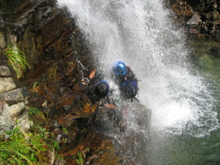 | 10m滝 | 10m滝は斜上バンドで水流の中を通過^-^; |