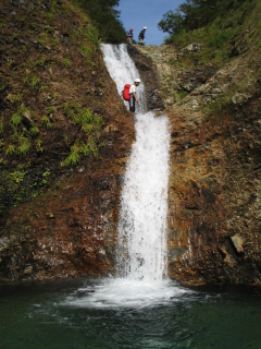 | 3条10m滝上で喜ぶかっきー^-^ | 8m滝は手前カンテを登った |