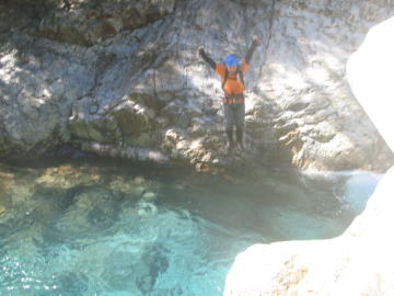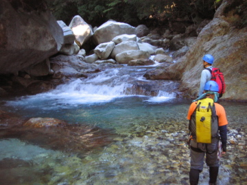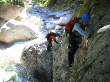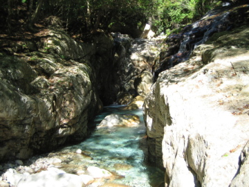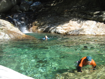 | 台風がそれた後の秋晴れの1日。 綺麗な景色を求めてのんびり前鬼川で遊んできました。 今回、癒し渓にしたのは先週の山行で痛めた足の具合が良くないって事が大きい理由ですが・・・(^-^; のんびりもいいですね!! さすがに初心者向けの超メジャーコース。 入渓者は他にもいっぱいいてはりました。 水量はいまいち多くはなかったですが、コバルトブルーの水で泳いだり、美しい景色を見ながら宴会したり♪ あたたかい岩の上で昼寝したりと、とても優雅な1日を過ごすことが出来ました。 遡行内容は昨年の前鬼川レポートとだいたい同じです。 |