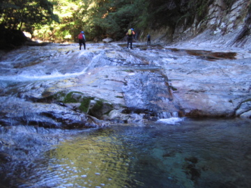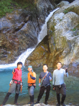 | 2段10m滝にて記念撮影 | 川幅一杯の120mナメ床 |