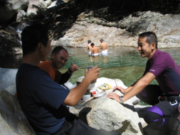 | 林道ゲート(7:45)---前鬼川出合(7:55/8:05)---2段10m滝(8:25/9:00)---垢離取場(9:55/12:30)---小仲坊(13:05)---林道ゲート(13:40) |