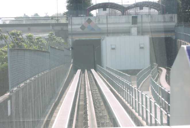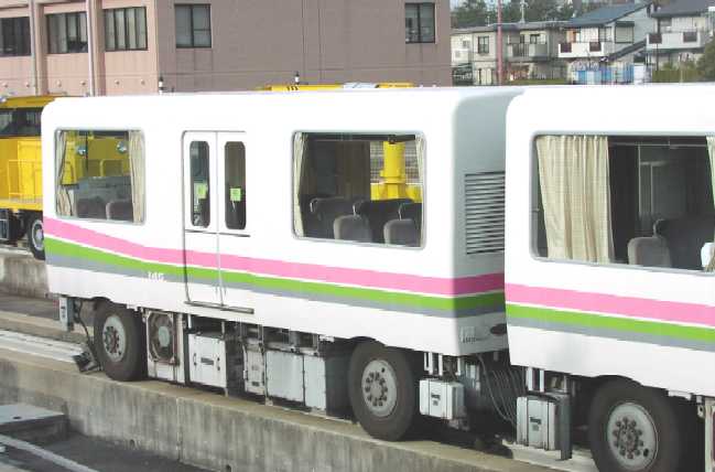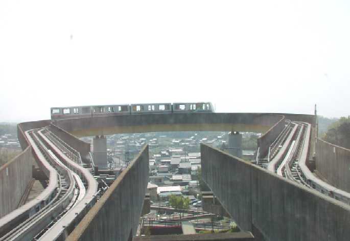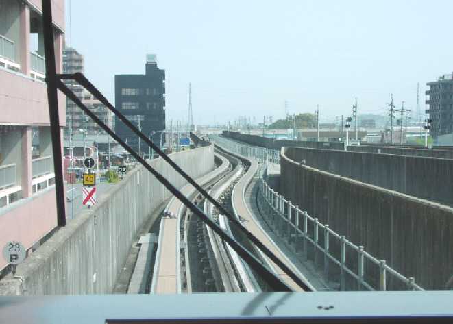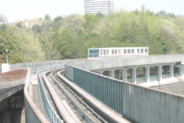 新交通システムなので、案内軌条方式のゴムタイヤによる走行ですが、他と違い中央案内軌条式を採用しています。