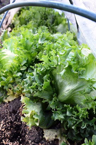 去年の9月30日〜12月31日に種をハウスで16連ポットに蒔いて11月21日〜3月10日に畑に移植したレタスの苗をビニールトンネルの中に入れています。今年はトンネルの入り口を防虫ネットで塞いだため鳥に食べられずに育ち、9月30日に種を蒔いた分は収穫できています。向かって右の1月31日と2月28日に種を蒔いた分はまだ、ハウスの中で育てています。これから6月にかけて順次収穫できそうですので楽しみです。