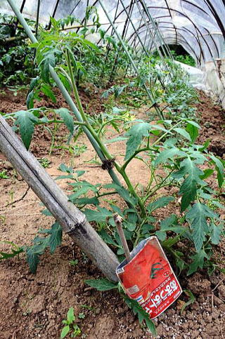 2月1日にハウスで種を蒔いて、籾殻堆肥の上に置いて育て、3月28日に鉢上げしてハウスに置き、4月26日と5月2日にミニハウス内に移植したトマトです。ミニハウスに入れるようになってからは、下葉が枯れたり、トマトの尻腐されが無くなりました。実が付いてきましたので、苦土石灰を入れ、カルシュームを葉面散布しました、実が4〜5cmになったら化成肥料と過燐酸石灰を入れる予定です。今は、順調に育っていますので、今年も、収穫が楽しみです。
