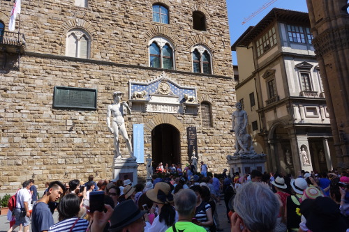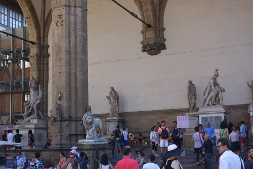 下の写真右はランツィのロッジアという屋根付きのオープンスペースがありルネッサンス彫刻の屋外ギャラリーになっているが、もとは共和制の市民集会の場所だったそうである。