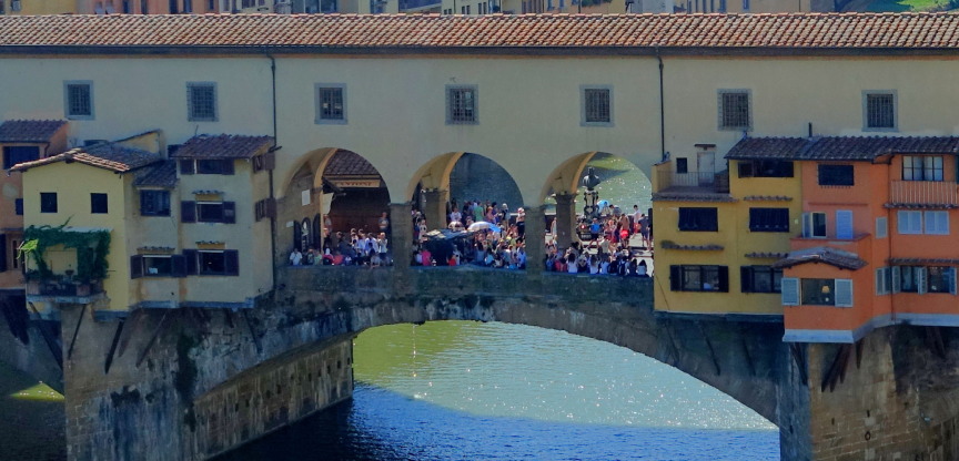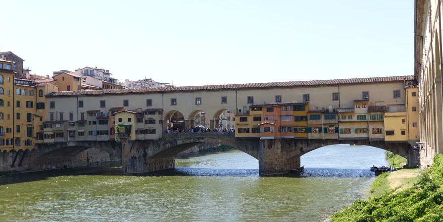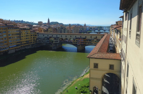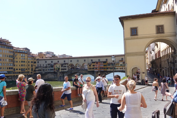 下右の写真、ウフィツィ美術館の3階の窓から見てその意味が分かりました。橋の屋根部分は2階通路でウフィツィ宮から対岸のピッティ宮まで廊下で渡ることができるようになっているようです。一階部分、通常の橋の上は庶民の通路。2階の屋根付き通路は特権階級用ということでしょうか。橋の両側には彫金細工や宝石店が並んでいるということでした。