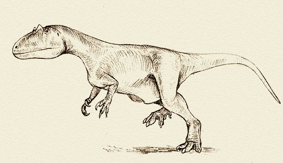 Carnosauria カルノサウリア 定義:鳥よりもアロサウルスに近いすべてのアヴィテラポーダ:鳥獣脚類(Avetheropoda) Definition of Carnosauria : Carnosauria comprises all avetheropods closer to Allosaurus than to Neornithes. ( Padian et al 99, pp72 ) アロサウルス Allosaurus fragilis 大型恐竜の化石を多産することで有名なアメリカのモリソン層から見つかる肉食恐竜。ジュラ紀の末期、1億5000万年あまり前の北米にすんでいました。体長は6〜7メートルくらいで、肉食恐竜のなかでは中形から大型といったところ。ただしあるものは10メートル以上あったようです。同じ時代の動物にはアパトサウルスやケラトサウルスなどがいました。アロサウルスは地層によって大きさや特徴が違うという話や、異なる種類がいるという話もありますが詳しくは知りません。前足の指は3本で人さし指がもっとも長く、そういうところはヴェロキラプトルや鳥と類似しています。手首の骨も基本的には同じつくりでおそらく柔軟でした。ただし、ヴェロキラプトルや鳥ほど自由には動かせなかったようです。