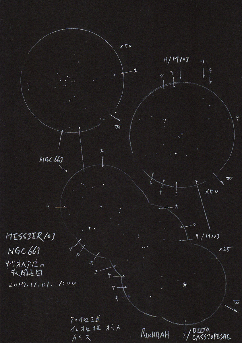 上の円は50倍の視野で、近隣の散開星団NGC663とM103を示します