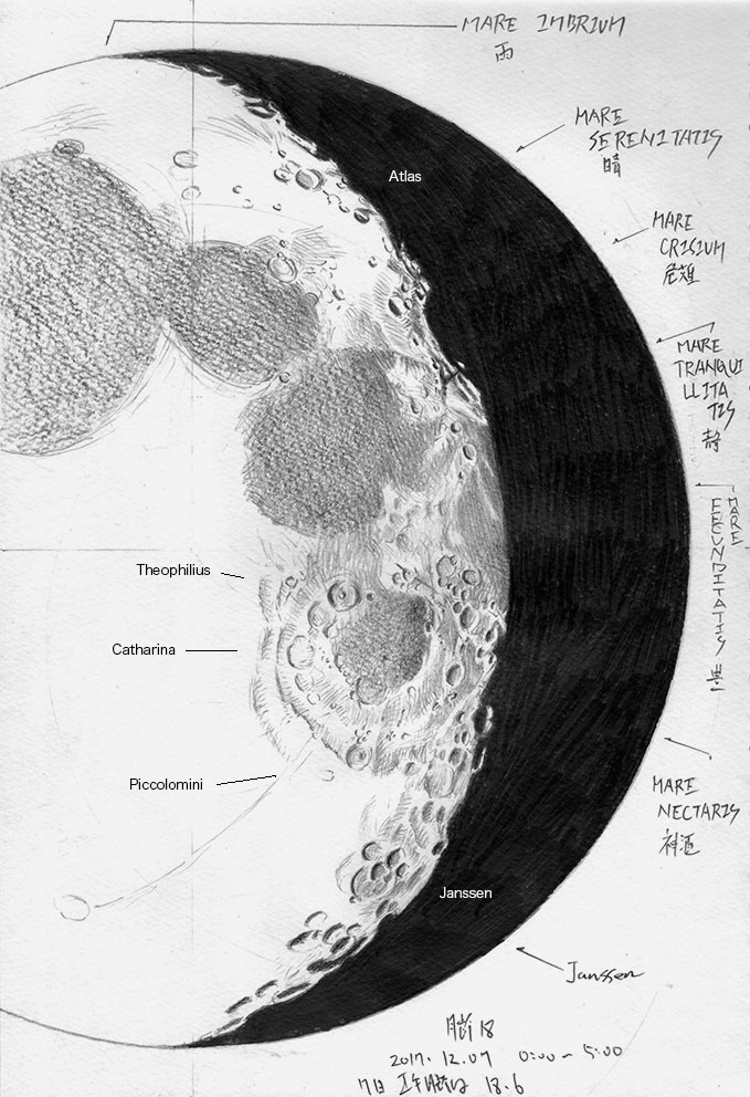7日の正午月齢は18.6、スケッチの時の18.1~18.3