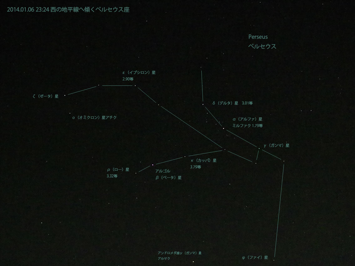 2014年1月6日 23:24 西の地平線へ傾き始めたペルセウス座