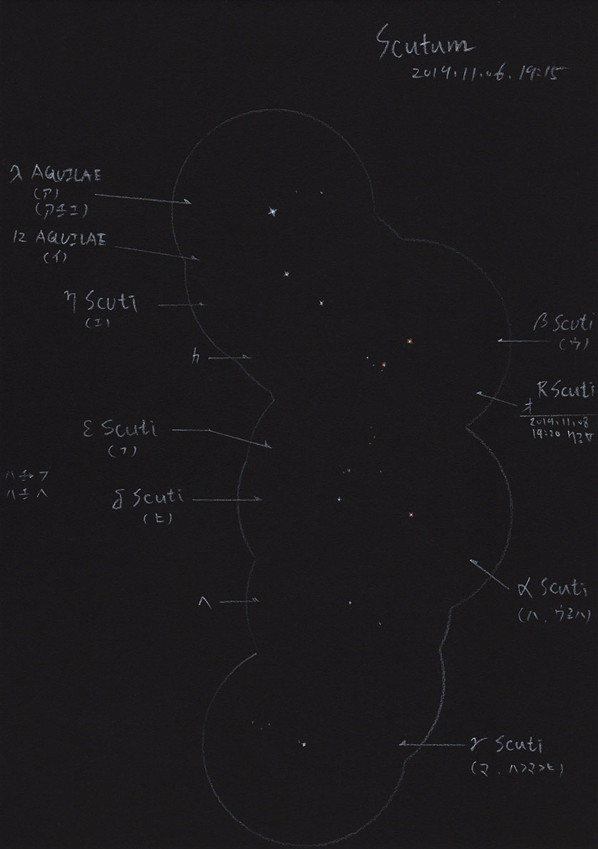 たて座で比較的目立つのは四つの星で、それが南北上下に長い菱形を作ります。上がβ星。真ん中左右にあるのがδ(デルタ)星とα星。そして南端にあるのがγ星。また、頂点のβ星の左下に変光星R Scutiが見えています。R星は2019年11月8日の時点で η Scutiとほぼ同じかやや暗い光度でした。ですからR星の光度は4.8等か5等。ほぼ極大時の明るさです。