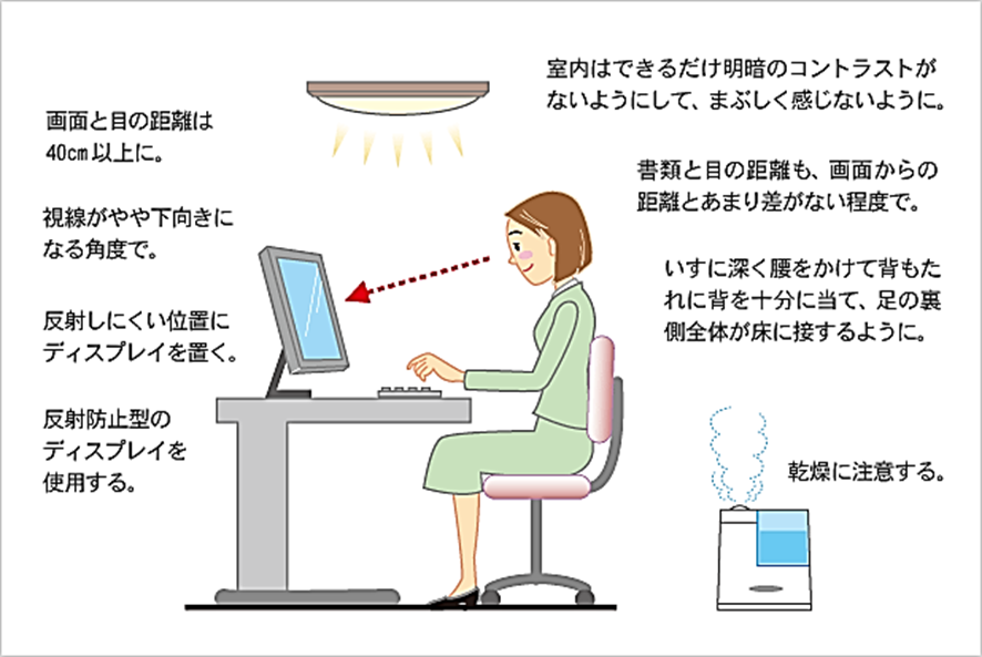 ICT眼症(VDT症候群)とは ITとは「Information Technology:情報技術」という語句の略語で、最近のテレビゲームとかパソコンなどを含むさまざまな情報機器あるいはその技術を意味します。そしてICT眼症とは、「IT機器を長時間あるいは不適切に使用することによって生じる目の病気、およびその状態が誘引となって発症する全身症状」をいいます。 VDT症候群(ブイ・ディー・ティーしょうこうぐん、英語:Visual Display Terminal Syndrome)とは、コンピュータのディスプレイなど表示機器(総称して Visual Display Terminal、VDT と呼ばれる)を使用した作業(VDT作業ともいう)を長時間続けたことにより、目や体、心に支障をきたす病気のことである。別名テクノストレス眼症、ICT眼症とも呼ばれます。 IT機器が普及するようになって、事務用のパソコン画面を見ながら長時間の仕事をする職種に、「目が疲れる」とか「目が乾く」、「頭痛がする」などの眼症状に加えて、全身的な症状を訴える人が増えています。これらの症状は「VDT(Visual Display Terminal)症候群」とか、「テクノストレス眼症」と呼ばれ、肉体的な症状だけでなく、最近では精神的ストレスも問題視されています。 また最近は、IT機器の画面も、画像の大きさ、色彩、文字などの形や表示の仕方、経済性などの目的別に、液晶やプラズマ、有機電界発光、発光ダイオード、蛍光表示管など多くのものがあります。さらに、コンピュータ画面や携帯電話から発生する電磁波のからだへの影響も考慮しなければなりません。これらのVDTによって引き起こされる、いろいろな目および全身の症状(過労)が「ICT眼症」です。