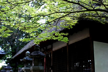 夜都伎神社境内。 カヤ葺きの屋根も美しい小さな神社建築。