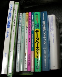 ●『ITの基礎知識』や『情報と職業』も少しずつ読み始めることにする。 【4/20金】 ◆昨日届いた教科書は、11科目分10冊。さすがに専門書ばかりで、かなり分厚い本も数冊あり、ページ数を数えると約2900ページもある。うち10科目9冊までが前期の受講で、試験は8月末。約4ヶ月で9冊の教科書を読むには1日平均約15ページという計算。難解な文章や多数の暗記項目もあるし、C言語の応用やネットワーク技術の修得などもあり、まだここに補助教材も送られてくるし、6月までに各科目の課題提出が必要だ。インターネット授業もこなしていかねばならない。科目等履修生は前期不合格科目を後期に再履習できるらしいが、それでも連日の残業で帰宅が相当遅くなっている状況で、これらの課題をこなしていくのはかなりハードスタディーになる見通しだ。(日々雑感995)