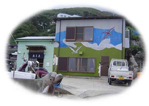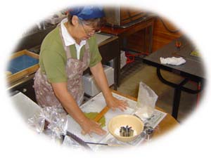 美美庵ではホウロクヤキの他にアシタバ入りのクッキーも作っています。御蔵島のアシタバは苦味が殆どないのでクッキーに入れるととてもおいしいのです。(写真はエビネの花の形やイルカの形をしたアシタバ・クッキーを作っているところです) クッキーもホウロクヤキも島のお母さんの手作りです。