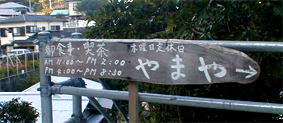山十一商店から御蔵荘に登る路地を行くと、途中で下の写真の看板があります。あとはこの矢印の先の小坂を下ると「やまや」さんです。村営宿泊施設「御蔵荘」の道路をはさんでほぼ真下にあります。 里の地図