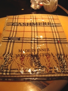 今回はマハラニさんの北京みやげ。 これはマフラーで、しかもカシミヤとなかなか上等なモノ であるが、よく見れば、 「INNER MONGOLIA」 とある。。。えっ、モンゴルの下着? いやいや「MADE IN INNER MONGOLIA CHINA」という表記から『中国・内蒙古自治区の生産品』を意味するのだろう。 一般的に「MADE IN KYOTO(京都製)」とかいう表記は無いのであるが、これはこれで面白くて良いことじゃないかな、と思う。 しかしながら、2枚目からの写真に写っているマフラーをご覧いただきたい。 一見すると、英国の某有名ブランドっぽいチェック柄であるが、やはりタグには、 「BURBERRY」 の文字が。。。けど縫製も悪く、妙に怪しいタグ。 いつも思うが、わざわざ有名ブランドの力を借りずとも、内蒙古特産品として売り出す方が良いと思うのだけど。 まだまだこれからの中国、さらに怪しく精進してくれよぉ。 |