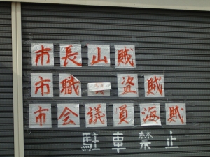 (これは平成17年11月28日にブログにて公開されたものです) 昨日は大阪市長選挙でありましたが、大阪市民のみなさんは投票に行かれました? ど〜でもいいような感じの面々ばかりで我が大阪市の行く末を更に不安になりながらも、私は自分の意志を込めて投票には行きました。。。けど低投票率のおかげか關さんの再選となりましたね。ま、再選されたのですから、これからの大阪市を考えて更に精進しる!と言いたい。 ところで本題に戻りまして、これは一昨日の投票日前日、天六近くの民家のガレージに貼られていたモノであるが、 市長山賊 市職員盗賊 市会議員海賊 駐車禁止 と今の破綻しつつある市政を揶揄しているのだと思うが、この一市民の叫びも、端から見れば単なる怪気炎としか見えないところがなんとも悲しい。 そう見えてしまうだけ、呆れて冷ややかにしかなれない市民の感情をどうか關さんは感じ取って欲しいものだ。 |