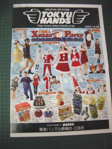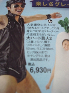 先日、新聞の折込に東急ハンズのチラシが入っていた。 この時期にふさわしく、クリスマス関連の商品が並んでいて師走もこれから、っていい感じだ。 それでチラシをじっくり眺めていたら、サンタのコスプレ衣裳の女性にちょっと萌えるも、その横に、 「大ハード芸人2」 と言う商品があり、思わず、 なんか 貧相なHG やのぉ。。。 とガッくし。 しかも「〜2」と言うことは、バージョン1もあったという訳で。。。「〜1」もちょっと見てみたい気もする。 他にも『パラパラレスラーセット(って、長州○力か?)』などもあって、欲しいような欲しくないような商品がぞろぞろと。。。必要なモノから怪しいモノまで幅広い取りそろえ、さすが東急ハンズである。 |