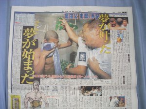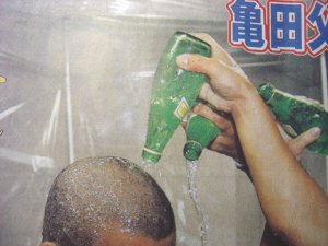 亀田の夏祭り(あの疑惑判定で物議を醸しだしたタイトルマッチ)があけた翌日、8月3日付けの日刊スポーツの裏表紙に載っていた写真であるが、祝勝会だけあって恒例のビールかけをやってるんだなぁ。。。え、亀田ってまだ未成年じゃないか?と疑問を持ったのだが、よく見ると、お互いにかけあっているのは、 ペリエ! じゃないですか! ペリエってただの炭酸水(といってもフランス産の高級なモノですが・・・)だから、未成年の亀田三兄弟も楽しくビールかけの臨場感を存分に味わえるというのはなかなかのアイデアである。 これからも高校生の間で広まりそうな予感はするけど、祝勝会の映像はほとんど流されていないので、これからの流行はちと微妙かも。 でも、ビールより高くつきそう。。。 | |