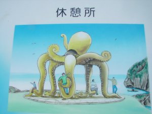 今回もImuimuさんから、怪しきアイランド・宮古島の素敵な一品を紹介します。 (本当にありがとうございます、Imuimuさん) 宮古島の南西にある来間島を訪れたImuimuさんは、島一番の高台、竜宮展望台へ行ったときのこと、そこに掲示されている案内図を見てびっくりされたという。 その看板、じっくり見ますと、 ![]() ひ、人が、 ![]() 喰われるっ! そう、展望台というのは真っ赤なウソ。 実は大タコの罠であったのです。 休憩がてらに近づいてふーっと油断した人をこうして絡め捕って召し上がる。。。これは非常にキケンである。 Imuimuさんも、 > どこから見ても、男性がタコに絡め取られております。 > 察するに、タコの休憩所かと。 > 宮古島に通い始めて10年。 > いまだに奥の深いところであります。 とのこと。 「怪しきアイランド・宮古島」。。。奥が深い(笑)。 私も10年ぶりに再訪してみたい気分でつ。 | |
