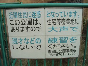 先日、大阪は千日前をあるいていたところ、浪花の笑いの殿堂こと吉本興業本社(NGK)の近くの公園にこのような看板が掲げられていてビックリ、 近隣住民の迷惑となっています。 この公園は、住宅密集地にありますので 大声で漫才などの練習を しないでください 「漫才禁止」の公園??? 浪花に生まれ育った私ですら、こんな看板はじめて見た。。。大阪らしいと言えばそうかもしれないが、漫才の練習ですら煩く感じてしまうのは、ここ最近は古くからの「まぁええやん」という大阪的な寛容さですらだんだんと欠如してきたあらわれなのかも知れない。 でも、この公園、他にも怪しい看板が。。。(次へ | |