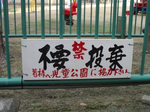 「漫才禁止」「巡察する交番」となかなかに怪しきワールドを形成している大阪は浪速区某所の公園でありますが、怪しげな看板が一枚あるとまだあるに違いない、と確信した私は、じっくり探すまでもなくまたもや発見。 禁 不要投棄 皆様へ児童公園に協力下さい 「不要投棄」??? 一見、意味が通るようにも見えるが、不要の意味から、「捨てることを必要としないことを禁ずる」となり、この看板は『どんどん捨てちゃっていいよ』と深読みできてしまうのである。 いっぺん、ゴミを捨ててみても面白いのかも知れないが、どないしたもんやら。 しかし、これを上回る怪しげな看板が。。。(続く) | |