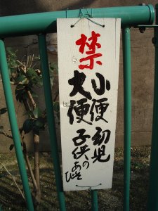 先日より紹介しております大阪・浪速区内にある公園でありますが「よい子の公園」と掲げているとおり、日本の将来を背負っていくよい子のみんなが伸び伸びと遊んでいられるように、との親心からあちこちにこのような注意書きをされているのか、と納得しつつ立ち去ろうとした目の前に、 禁 小便 大便 幼児子供の あそび え、子供のあそびも禁止する「よい子の公園」とは? 小便や大便をするな、というのは大いに理解できるが公園では子供達は遊ばずに勉強しろとでも? いったい、なんのための公園なのか? 土曜日の真っ昼間だというのに、私以外誰も公園にいなくて寂しい理由がわかったような気がした。 | |