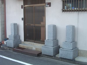 先日、京都へ行って来たときのこと、阪急大宮駅を降りて壬生界隈を歩いていると、一見ふつうの民家なのに妙な違和感を感じたので立ち止まったところ、 玄関に墓石! これはいったい。。。別にこの屋敷の上部にもお墓を宣伝するような看板なども一切無く、いたって普通の民家だけに、ひときわ異彩を放っているのだ。。。こ、これって、 門墓と呼べばいいのだろうか? でも、なかなかに素晴らしい! 玄関に墓石とは、ここの主はかなり先鋭的な感覚の持ち主に違いない。 さすが京都、怪しきモノもひと味違う。 | |