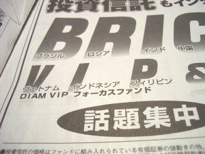 先日、日本経済新聞を何気なく読んでいたところ、とある証券会社の広告にちょいと気になった。 この広告、世界を股にかけて投資を行っているようで、最近は急成長で注目のBRICs(ブラジル・ロシア・インド・中国)と呼ばれている国々のファンドの勧誘を行っているだけでなく、 VIP & トルコ と呼ばれる国々の投資話も囁いている。。。トルコはわかるけど「VIP」ってほんと、大層なニックネームを付けられてるなぁ、とよく見ると、 V = ヴェトナム I = インドネシア P = フィリピン の国の頭文字を合わせた呼び名だという。。。ちょっと待て、これらにお住まいの方々には大変に申し訳ないが、マジで『VIP』な国々か? この広告には、 > 新興国は、今後の経済成長への > 期待から、いま、世界中の注目 > を集めている投資先です。 との謳い文句が。。。これらVIPな国々が、世界中のVIPな連中に食い散らかされぬようがんばってくれ、と思った私であった。 | |